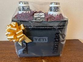 The YETI Hopper Flip 18 with Cold-cell insulation, a closed-cell foam that offers superior cold-holding to ordinary soft coolers, and capacity of up to 16 cans plus ice and Two (2) YETI Rambler 10 oz Wine Tumblers, vacuum insulated, stainless steel with MagSlider Lid.