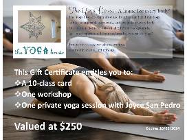 A home for every body! The Yoga House is built upon the foundational belief that yoga should be enjoyable, accessible, to every body. This certificate (Valued at $250) includes: A 10-class card to the Yoga House, One workshop, and one private yoga lesson with Joyce San Pedro.