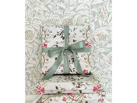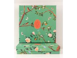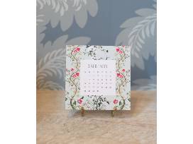 Each calendar includes twelve watercolor designs and letter-pressed numerals on 6" square cards. Nestled in a collectible linen box with a brass easel stand.