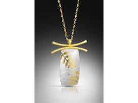"Torii Shrine" Forged 18k gold, embossed fine silver w/24k Keum boo fern motif pendant approximately 1.5" H x .75" W
