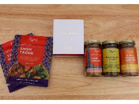 This spice set includes: 2g of authentic Afghan saffron, jar of wild black cumin, jar of Kabul Piquant Chicken spice blend, jar of Ras el Hanout spice blend, packet of Shish Taouk spice mix, and packet of Tandoori Masala spice mix.