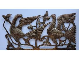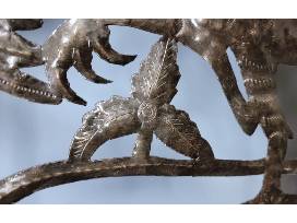 "All the metal is sourced from 55-gallon steel oil drums, a readily available byproduct of shipping from the harbor in Port-au-Prince. Each drum is first burned to remove all paint and residue, then cut vertically down both sides and flattened into panels. Since the artists try to waste as little metal as possible, contemporary metal works tend to have standardized dimensions based on the size of these panels. The artist then uses various tools, including hammers and chisels, to cut away negative space until they have the basic design they want. Detail is added by hammering tiny indentations into the back of the metal to create raised patterns on the front." (Source: Haitihub)