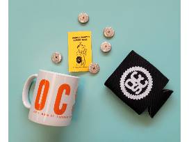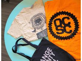 In addition to a $50 gift card, includes an OCSC Mug, OCSC Koozy, OCSC art t-shirt (size small), OCSC beach towel, and OCSC buttons all in an OCSC tote.