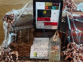 Handcrafted artisan wood charcuterie board by Sarasota local master craftsman Sam Hess. Includes artisanal cheese gift cards totaling $110, Selva gift card of $50, Darden Restaurants gift card of $100, charcuterie serving utensils, & butcher block conditioner.