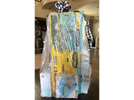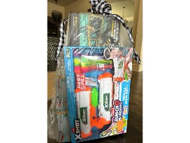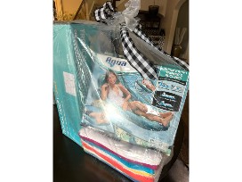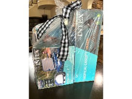 Floating Coolers; Tropical Canopy Pool Lounger; Water gun plane ride ons (2); Neon water balloon fight; Volleyball pool game set; Ultimate 2 in 1 pool float; Infaltable surfboard; Sea turtle ride; and Pack of pool towels