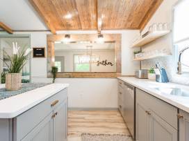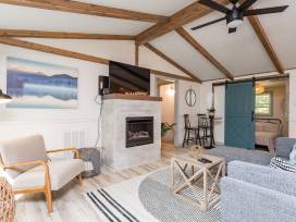 This beautiful oasis boasts an open floor plan and vaulted ceilings on main level. The updated open concept kitchen features quartz countertops, tiled backsplash, stainless appliances, and fully stocked kitchen for cooking endeavors. Off the kitchen, there is a spacious dining area, living area and full bathroom. The dining area features seating for 8. There is additional seating in the kitchen island. The living room is open to the kitchen and has a gas fireplace. There are three bedrooms on the main level. The first bedroom is a full bed with bar door. The second bedroom features king bedroom with attached bathroom en-suite. The master bathroom features single vanity and tiled shower. The third bedroom also features a king bed and is attached to a large bathroom with vanity and tiled shower/tub combo.