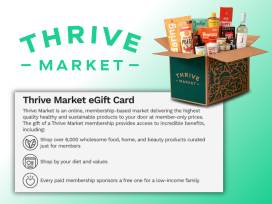 Thrive Market is an online, membership-based market delivering the highest quality healthy and sustainable products to your door at member-only prices. A Thrive Market membership provides access to incredible benefits including: Shop over 6,000 wholesome food, home, and beauty products curated just for members; shop by your diet and values; every paid membership sponsors a free one for a low-income family