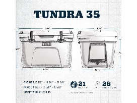 The Tundra 35 dimensions are 20 in long x 16 1/8 in wide x 15 1/4 in high with an empty weight of 20 lbs NOTE: All Tundra models come standard with one dry goods basket