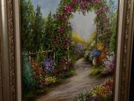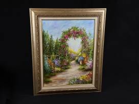 1This beautiful 25"x 30" painting with gorgeous flowers and trellis will look great anywhere and make you feel like you're in an English Garden. It's artfully completed with a linen mat and decorative gold frame. The artist, Garlin Russell, is a Matthews native.
