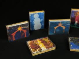 4These cards were created by some of our Rainbow Young Adults. This design features a golden yellow and white candle with a warm toned background. Hand-crafted using Gelli Pad alcohol ink printing by Haley Liszka. Each box includes 10 cards and 10 metallic gold envelopes.