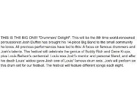 Two tickets for the Friday night performance of Drummers Delight by Josh Duffee and his big band. July 13th, 2024 at the Hackensack Community Center. Doors open at 6:30. Presented by the Northwoods Arts Council. For more info on this event and many others, visit the NAC's Facebook page at Northwoods Arts Council