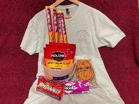 Sun and Fun filled this bucket with lots of Jerky treats, sunflower seeds, candy plus a mint colored XL T-shirt.