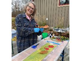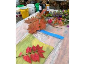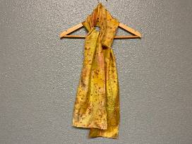 This 100% silk scarf has been eco-dyed by hand with locally foraged leaves and sumac. Scarf is hand rolled and stitched.