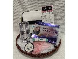 Sultry Lash and Brow gift basket containing compact mirror; teeth whitening system; makeup bag; heated eyelash curler; eyelash conditioner