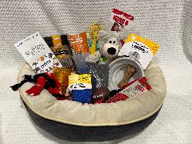 dog bed; $25 gift card(in basket); CMFCAA cup, pen, key chain, small football; Kong rope; chew bone; silicon bowl; brush; Kong wild Knots Animal; Travel quick dry cloth; chicken flavored rolls; squeeze toy