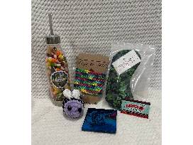 small items locally made by crafters inside the Baristago Coffee House Boutique- bottle of candy; eye pillow; cup warmer; crocheted bee; coaster