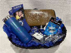 Concerns of Police Survivors Basket including family picnic blanket, COPS Travel Mug, Mini-Flashlight, "Back the Blue" Bracelet, Official COPS Coin and beautiful blue candle flashlight.
