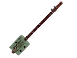 3-string electric guitar tuned to GDG. Handmade except for the metal components; the neck, fingerboard, and bridge are all hand-shaped and finished. A fun, playable instrument with a unique look and sound.