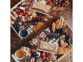 Feeds up to 10 people. Includes an assortment of meats, cheeses, crackers, fresh + dried fruit with savory and sweet touches.