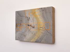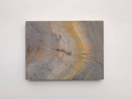 This work is part of a 2021 series imagining text from public health warnings transposed on slabs of granite and marble. Imbued with the permanence of carefully carved commemorative inscriptions and monumental architecture, these paintings proposed a permanence in the ever-changing lexicon of contagion.