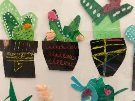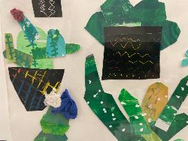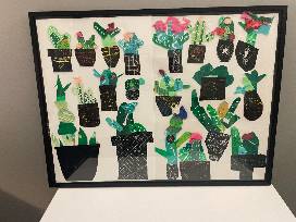 The second grade artists made these adorable succulent plant collages out of papers they painted, tissue paper, and scratch paper. This nature-loving class enjoys finding inspiration from plants and animals. This collage would look lovely in your home and there is no green thumb required to keep it alive! (24" x 18")