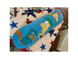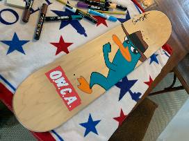 Wood skateboard deck with paint-pen illustration of Phineas and Ferb, Perry The Platypus, and on the reversed side, Agent "P" of the O.W.C.A. - by Jeff "Swampy" Marsh, Co-Creator of Disney's Phineas and Ferb.