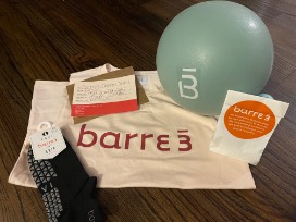 Barre3 month membership (unlimited), tank Top, exercise ball, barre3 socks, and bath salt.