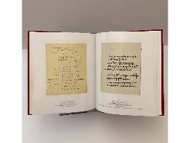 This copy of the hardcover exhibition catalogue (now out of print) was available for visitors to consult within the gallery space. It bears its original label "GALLERY COPY" in the top right corner of the front cover and shows slight wear, with some small black spots on the cover. The catalogue has been signed by the exhibition's co-curators, and it includes an insert with Simon Tolkien's remarks from the exhibition's opening.