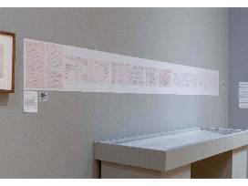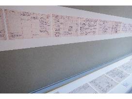 This vinyl decal was affixed to the wall above the exhibition case that displayed original pages from the time-scheme. The decal reproduces the complete time-scheme, tracking the story's chronology from beginning to end. Because the original decal is in poor condition a newly printed version will be included with the purchase. The banner measures 160" in length (13'4").
