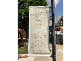 This outdoor vinyl banner is imprinted with two manuscript images. On top is a version of the Lay of Earendel (MS. Tolkien Mss-3/1/19) and beneath is a drawing of the Doors of Durin (MS. Tolkien 3/3/10/11b). The reverse shows the exhibition branding. The banner measures 57.5" x 24".