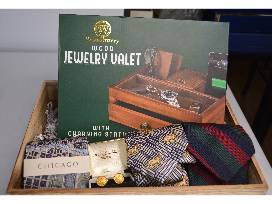 0Basket includes Woodbury wood jewelry valet, Phillips Menswear bird dog tie, antique gold horse cufflinks, Civitas 100% silk map of Chicago tie, Breuer 100% silk navy, green & red woven tie.