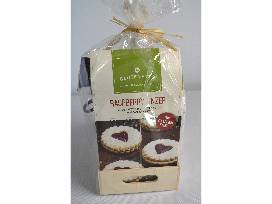 1Basket includes gluten-free raspberry linzer Italian cookies, hand-poured wood wick candle, and wick trimmer, in a wooden tray.