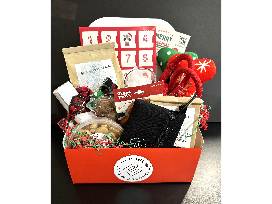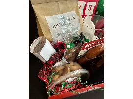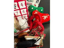 0Dog advent calendar, 2 bags of Bredwell dog treats, peanut butter dog candies, set of 2 decorated dog biscuits, gingerbreak dog teether, Bredwell zippered neoprene pouch, red nylon leash, 2 christmas-themed soft bone toys, plastic wine glass, and a 15% off Bredwell coupon.