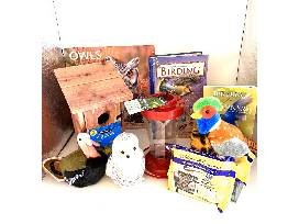 Basket includes: Bluebird house, hummingbird feeder, suet feeder, woodpecker suet, bird food, a 2024 bird calendar, books on birding, and playful stuffed birds.