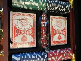Prep for your next poker night with this package! Includes a poker set with playing cards, dice, and four (4) colors of poker chips in a carrying case and four (4) retro Kansas City beer can glasses.