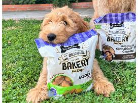 These treats are for the dogs! Package includes: Barbeque Chicken flavored treats, golden and vanilla flavored sandwich cookies, and cookie dough flavored wafers plus a $25 gift card for the BluHawk Three Dog Bakery and a purple Three Dog Bakery bandana. Certificate expires 9/9/2024.