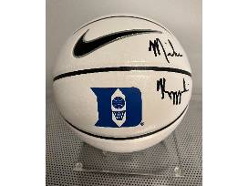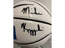 The full-size Duke Univeristy logo basketball autographed signed basketballs include Coach Michael William Krzyzewsk, also known as "Coach K" and Jon Scheyer. The package also includes three Coach K signed t-shirts, one Duke tumbler, one set of 3 Duke golf balls, one Duke magnet, one Duke phone wallet, one Duke keychain, and one Duke lanyard.