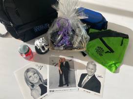 Autographed pictures of Vanna White and Pat Sejak. Lots of other fun Wheel of Fortune swag including the sweatshirt, gym bag, tumbler, hat, pens, satchel and more!