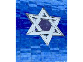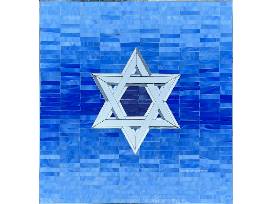 This Star of David piece features a background gradation in shades of blue and mirror that gives the illusion of depth.