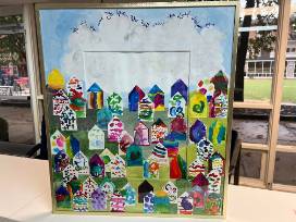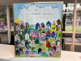 Each SK student created their own tiny house that were assembled together to represent their community. Matted and framed, 19" X 22" brass.