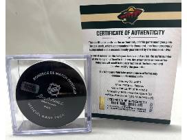Bid now on this autographed, game used, goal puck scored by Wild #46 Jared Spurgeon (9). This puck was scored at 12:39 of the 2nd Period of the Wild vs. Buffalo Sabres game 1/28/23 at Xcel Energy Center assisted by #89 Frederick Gaudreau(11) and #5 Jake Middleton (6). Wild Win 3-2 in SO. Puck comes with acrylic case and Wild Certificate of Authenticity with tamper proof serial number.