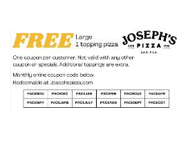 Coupon for Monthly Pizza for one year from Joseph's Pizza. Receive one large, one topping pizza each month; starting November 2023 through October 2024. Buon Appetito! Online orders at the Beaches Store only.