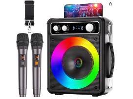 Host the best house party with a Karaoke machine (portable bluetooth speaker with 2 wireless microphones, PA System + LED lights)