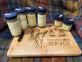 spices and a lawyer cutting board. Cooking /entertaining gift basket.
