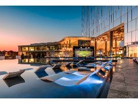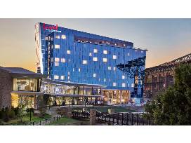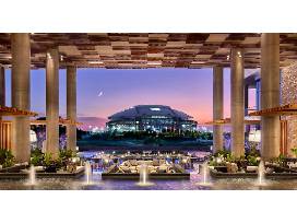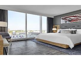 International Airport. Accommodations range from contemporary rooms with floor-to-ceiling windows to sleek suites with terraces, wet bars, and stadium views. All have Wi-Fi, flat-screen TVs, and minifridges, as well as coffeemakers. There is an onsite restaurant, Cut & Bourbon, as well as two chic lounges, an infinity pool, a poolside bar, a 24-hour gym, and a market.