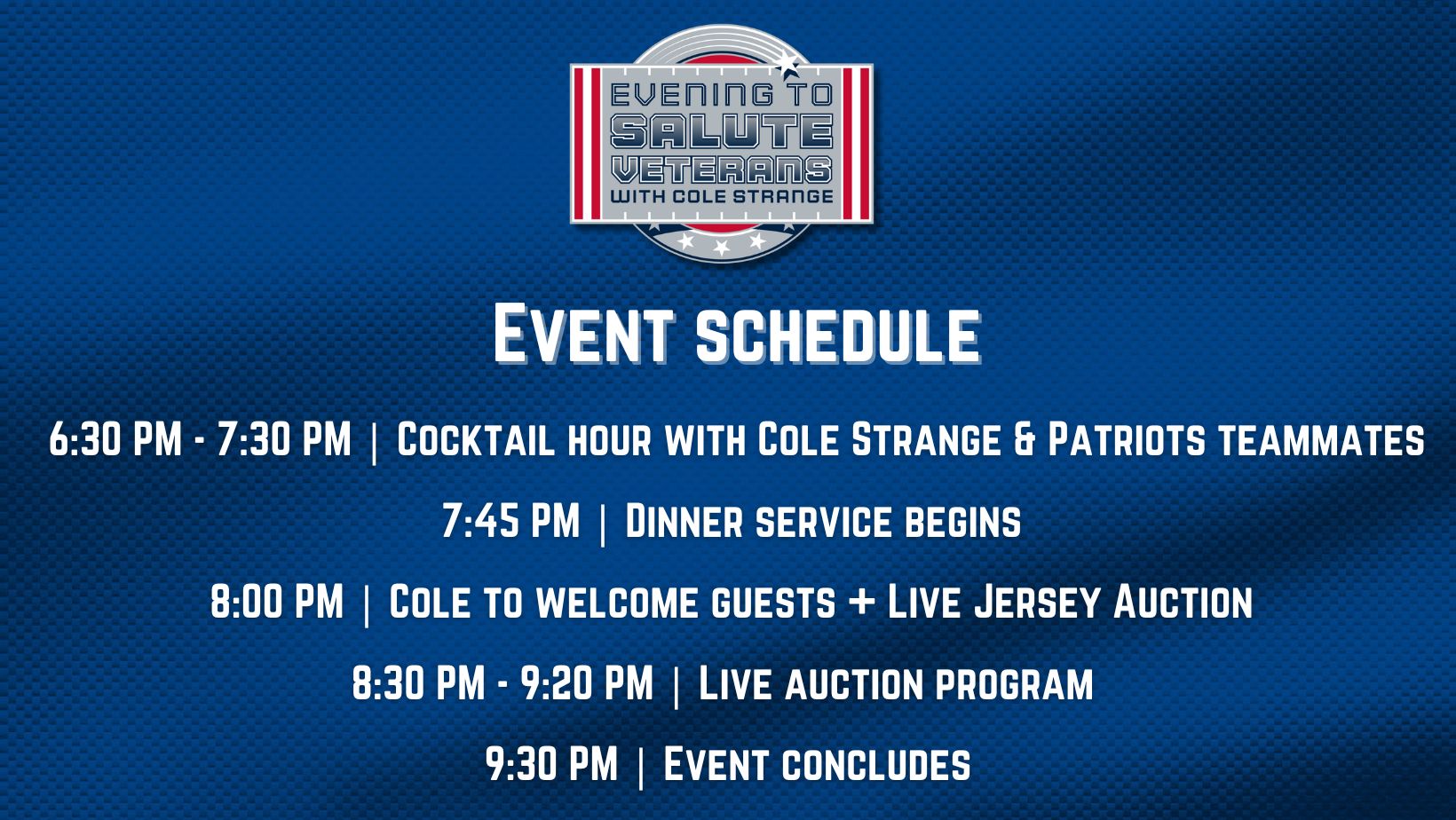 New England Patriots guard #69, Cole Strange will host his inaugural fundraising event, Evening to Salute Veterans with Cole Strange inside Gillette Stadium's West Putnam Club and Atrium, on Monday, November 6, 2023 from 6:30 PM - 9:30 PM ET.