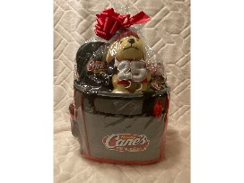 Gift basket includes Raising Cane's mascot toy, t-shirt, koozie, insulated bag, various gift cards for meals and drinks.