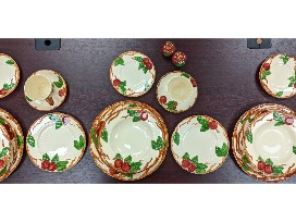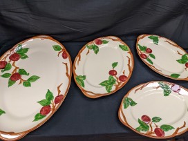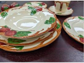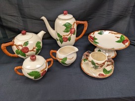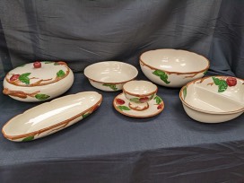 1Lovely Franciscan Earthenware set. Wonderful gift for someone setting up a household. Most pieces have the TV shaped Made in the USA stamp. A few have the California stamp and a few have the made in England stamp. Set Contains: 12 Dinner plates 15 Salad Plates 12 Bread and Butter Plates 13 Soup Bowls 10 Cups and 15 Saucers 6 Sherbet Bowls with saucers Serving Pieces: Salad Bowl Round Serving Bowl Divided Vegetable Bowl Pickle Dish Round Covered Casserole 18" Turkey Platter 14" Large Platter 12" Small Platter Coffee Pot Tea Pot Cream and Sugar Lemon Bowl Apple shaped salt and pepper Footed Compote Also included: a gravy boat, 3 small bowls and a few saucers that have some chips and cracks.