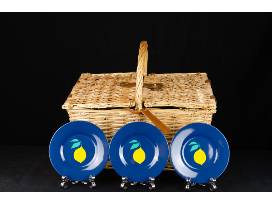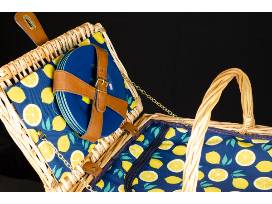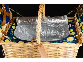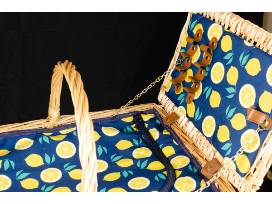 1This basket is made of natural light wicker with an insulated waterproof lining compartment for your food or beverage. Interior basket fabric is a beautiful navy with lemon and greenery pattern. Includes four 7"D bamboo plates in navy and lemon pattern, space for silverware and cups, and a picnic guide. Picnic guide contains a picnic packing list, helpful tips, and conversation starters to help you connect in your adventure together. Adorned with vegan leather straps and gold metal hinges. Wipe basket and interior with damp cloth. Plates-hand wash only. 18"L x 9 1/2"W x 13 1/2"H. Handle height 7". Plates 7"D. Imported.
