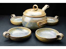 Ceramic glazed pottery soup/chili tureen & ladle w/4 matching bowls (brown & blue hues). Tureen approx. 5" tall x 7" wide at widest point. Bowls approx. 5 1/2"W x 1 1/2" deep.